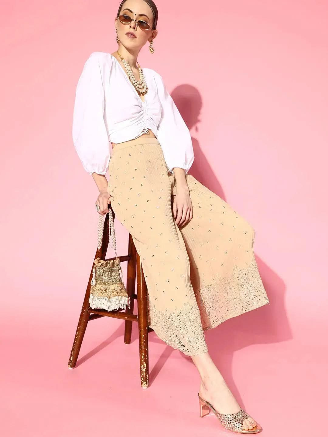Beige Printed Georgette Palazzos