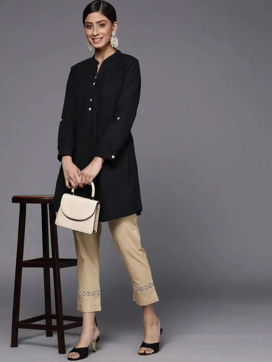 Our beige cotton woven trousers feature a partially elasticated waistband, flat-front with no pleats design, and mid-rise waist style with button closure and roomy pockets. Adorned with an elegant hem design and fine embroidered lace edges, this intricate style is perfect for festive celebrations.