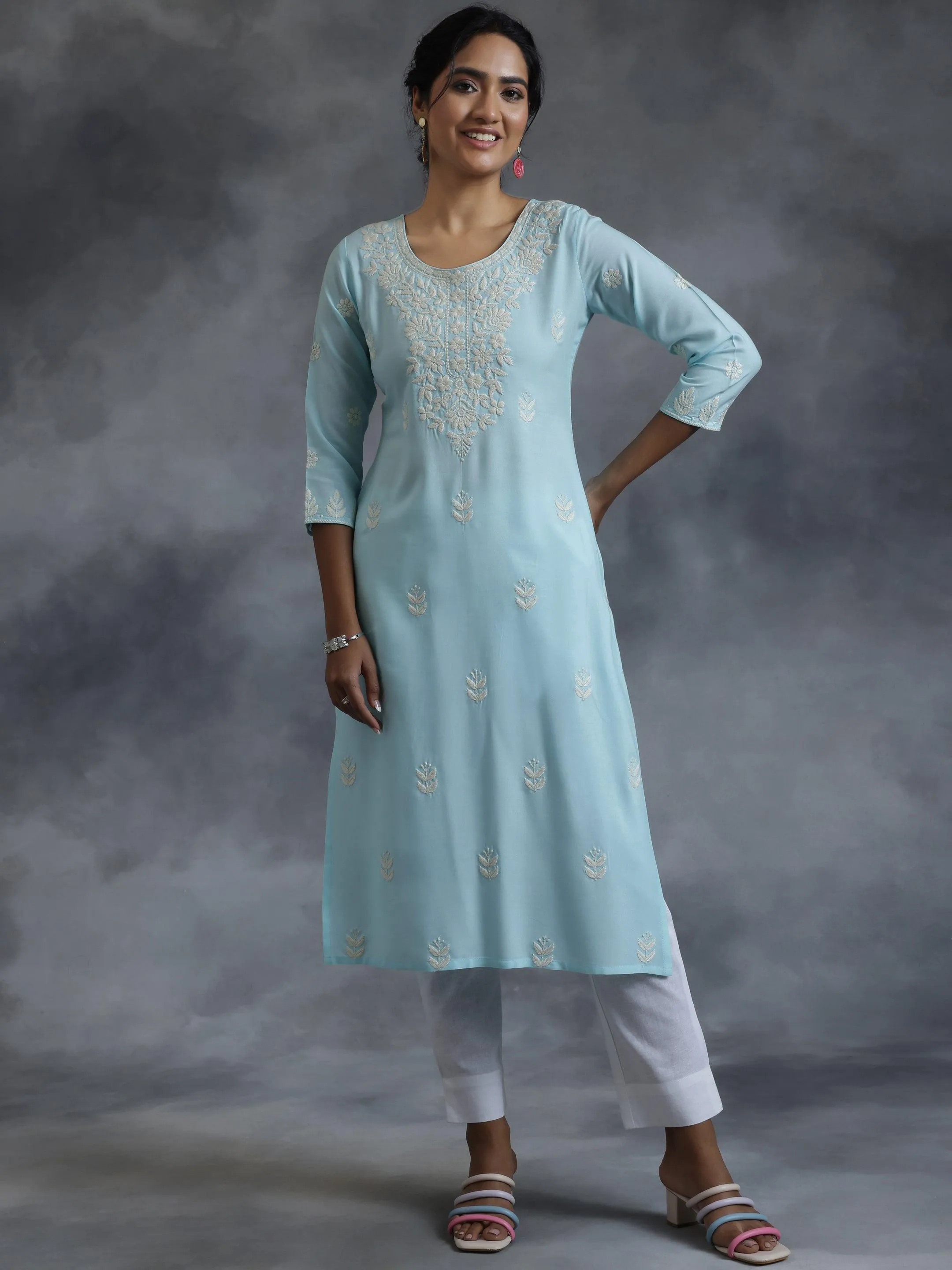 Blue Embroidered Rayon Straight Kurta