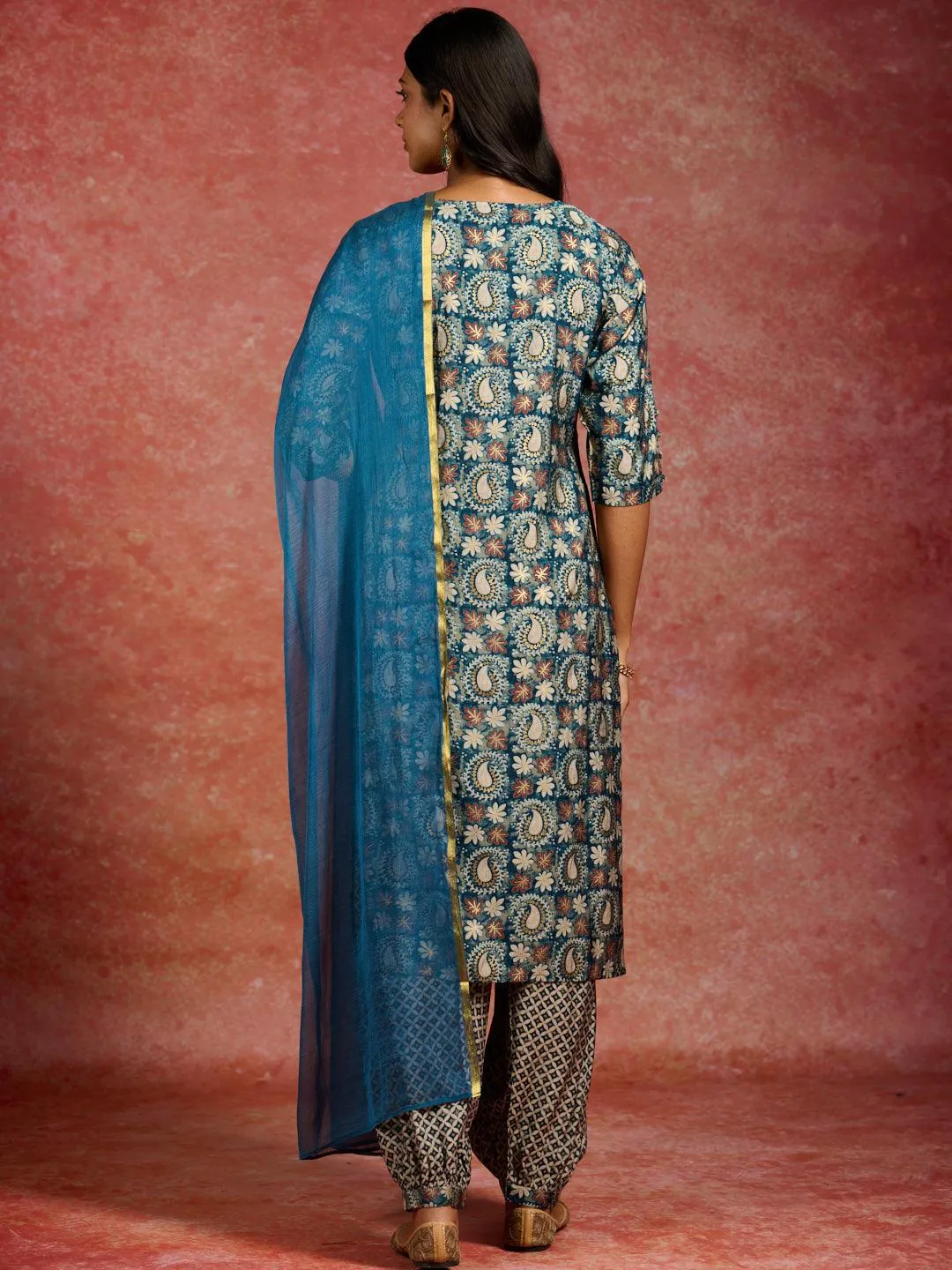 Blue Printed Silk Blend Straight Suit With Dupatta