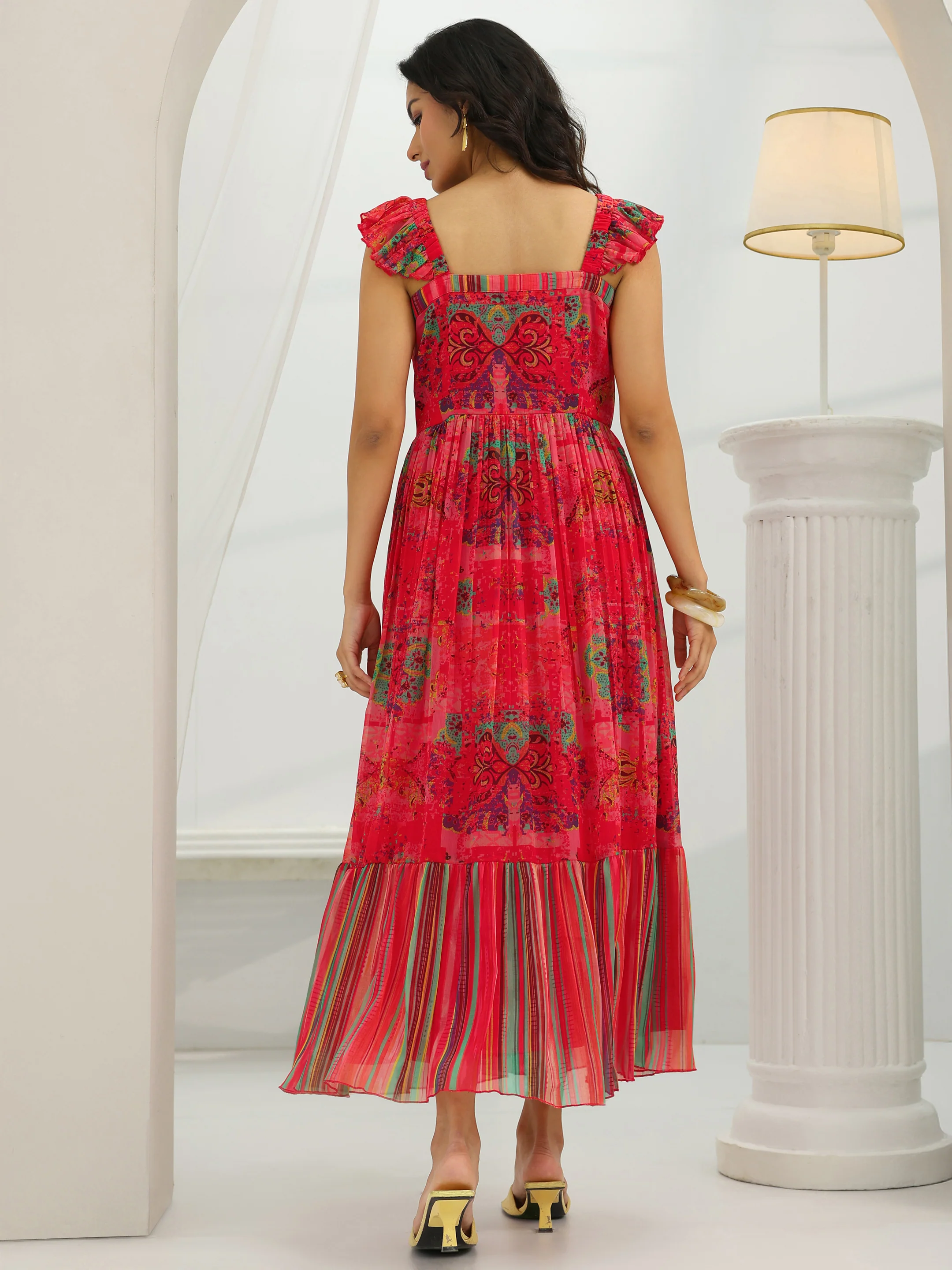 Our red printed chiffon maxi dress features a square neckline, sleeveless design, and a flared hemline. Highlighted with captivating Abstract Print, this style is perfect for Fusion Wear..