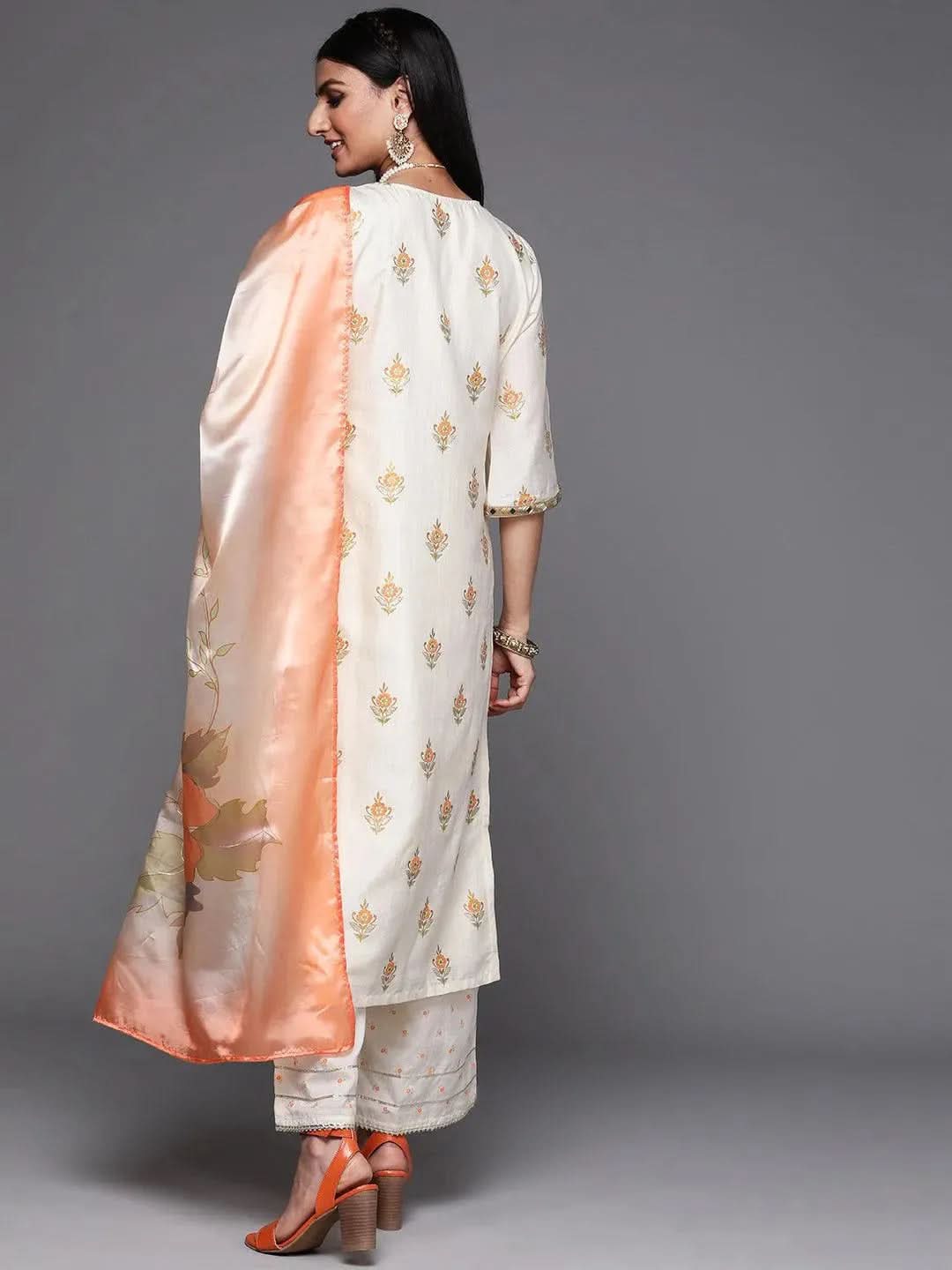 Cream Printed Silk Straight Kurta With Palazzos & Dupatta