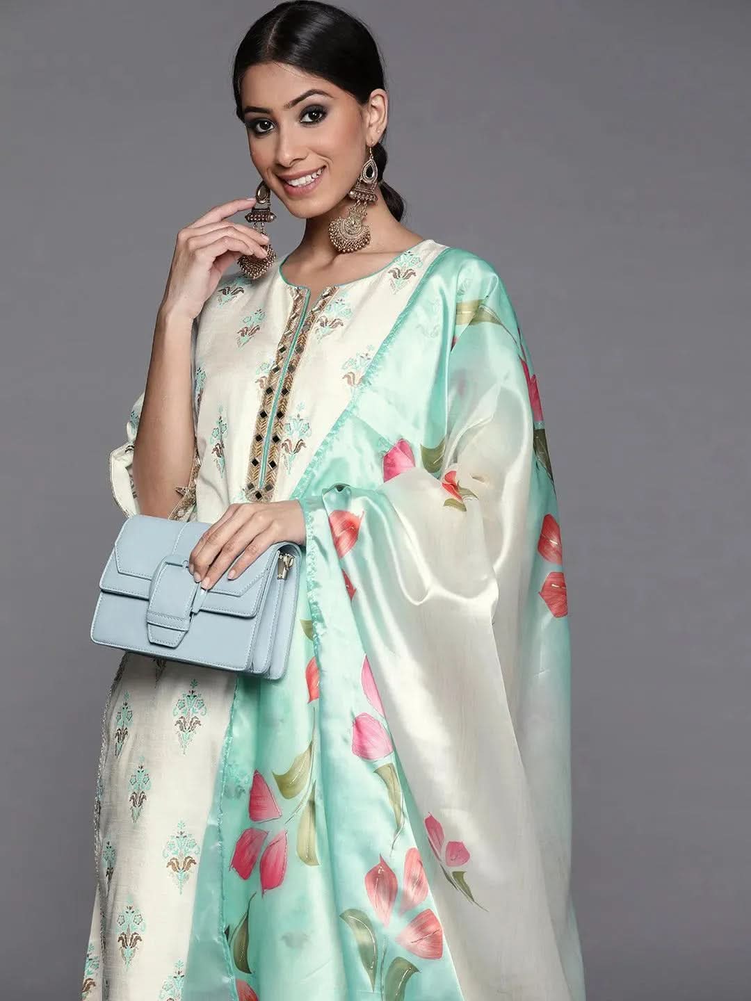 Cream Printed Silk Straight Kurta With Palazzos & Dupatta