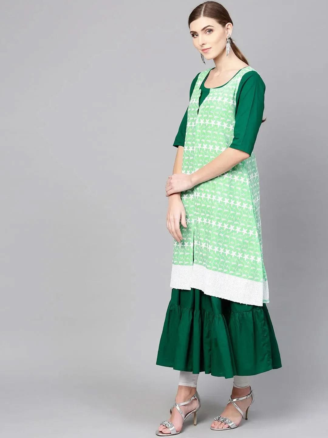 Our green embroidered kurta features an A-line silhouette with a ruffled hemline, round neckline, and half sleeves. Complemented with a stylish embroidered sleeveless shrug. Elevated with captivating floral embroidery, this style is perfect for casual outings.