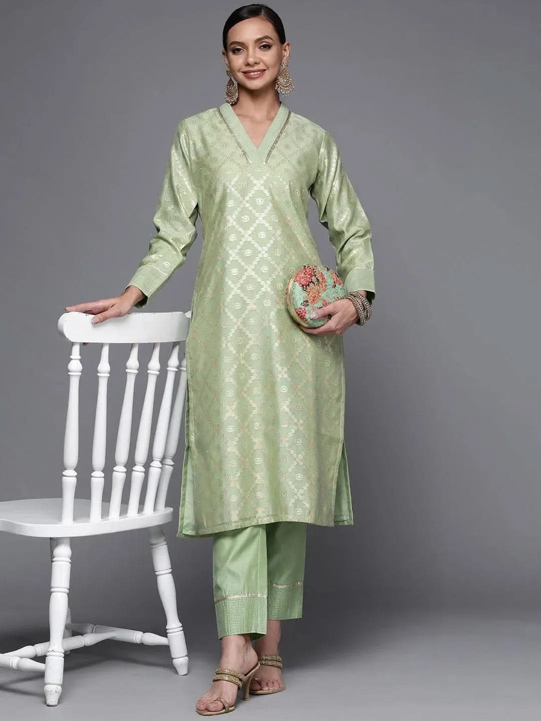 Our green woven design straight-fit Chanderi silk kurta features a classic V-neckline and statement sleeves. Adorned with delicate Gota Patti accents, this elegant style is perfect for daytime festivities.