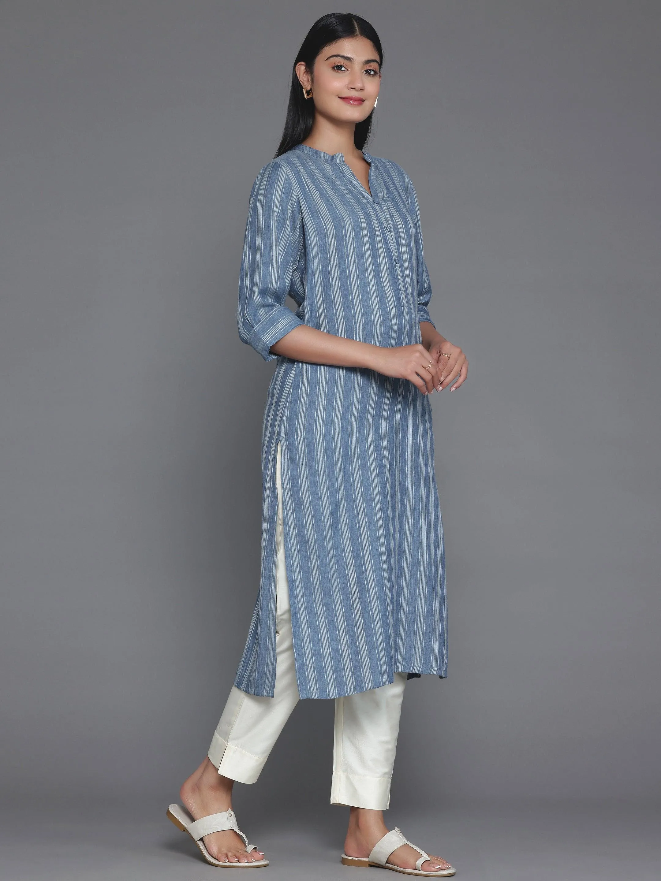 Our grey striped straight-fit kurta, crafted in viscose rayon fabric, features a mandarin notched neckline and three-quarter sleeves. Elevated with pocket detailing and handcrafted fabric buttons, this style is perfect for elevated everyday wear.