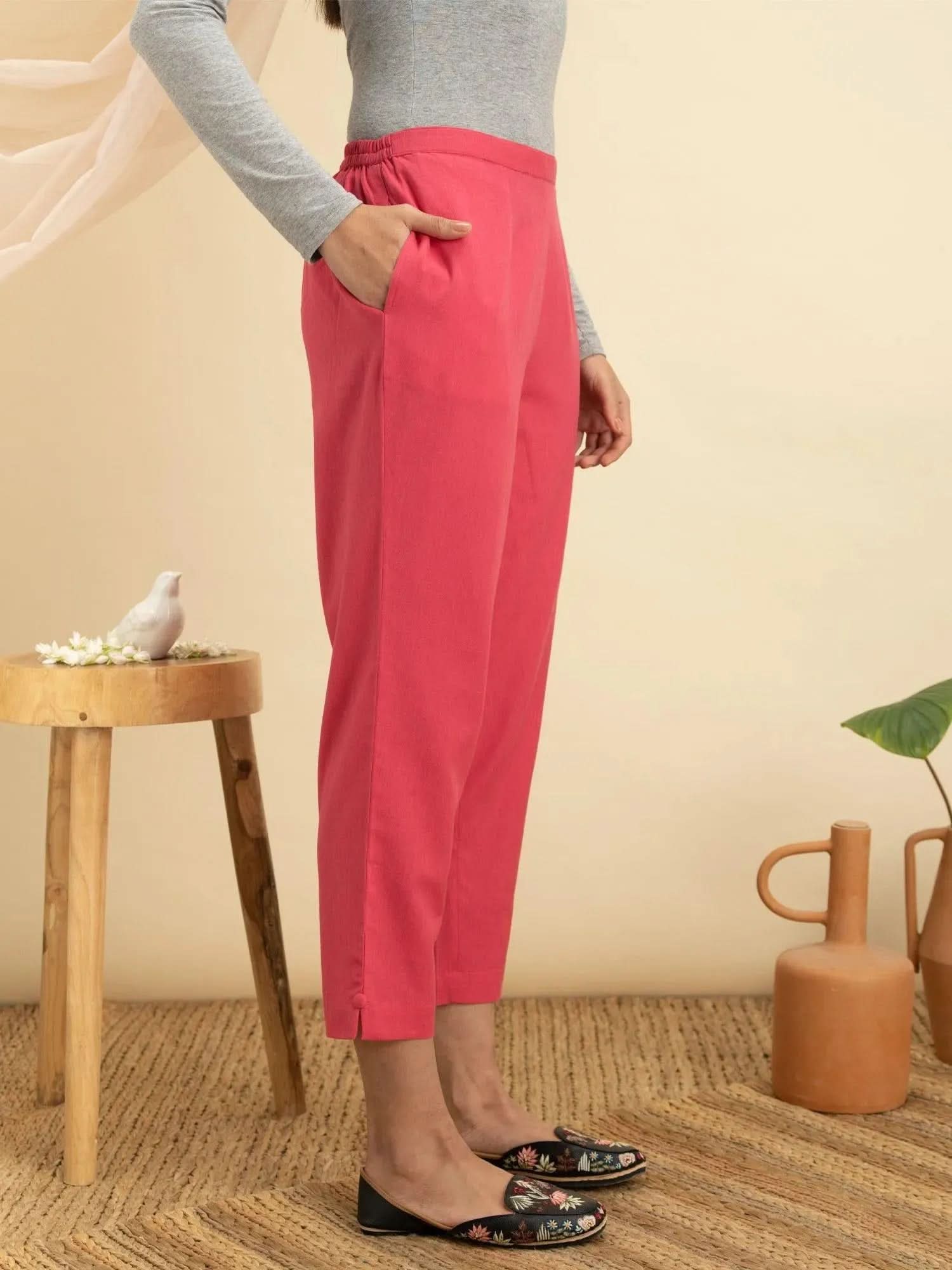 These straight cut magenta trousers are designed in a tapered fit with an elasticated back. Made in cotton and detailed with matching buttons and roomy pockets.