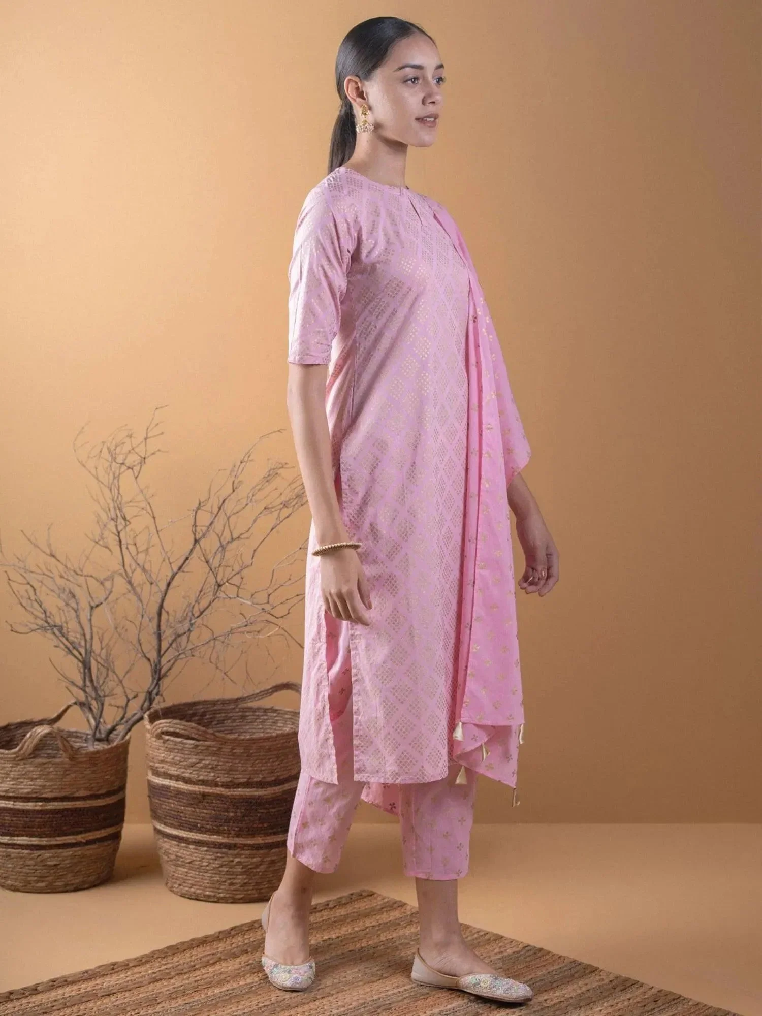 Spin around your ethnic look as you wear this Pink coloured kurta palazzo set from Libas. Kurta is featuring golden block print pattern all over. It comes along Comprising an inner basic kurta, matching palazzo pants and a block printed dupatta with tassels at border. Comfortable to wear all day long, this set is best clubbed with heels and g