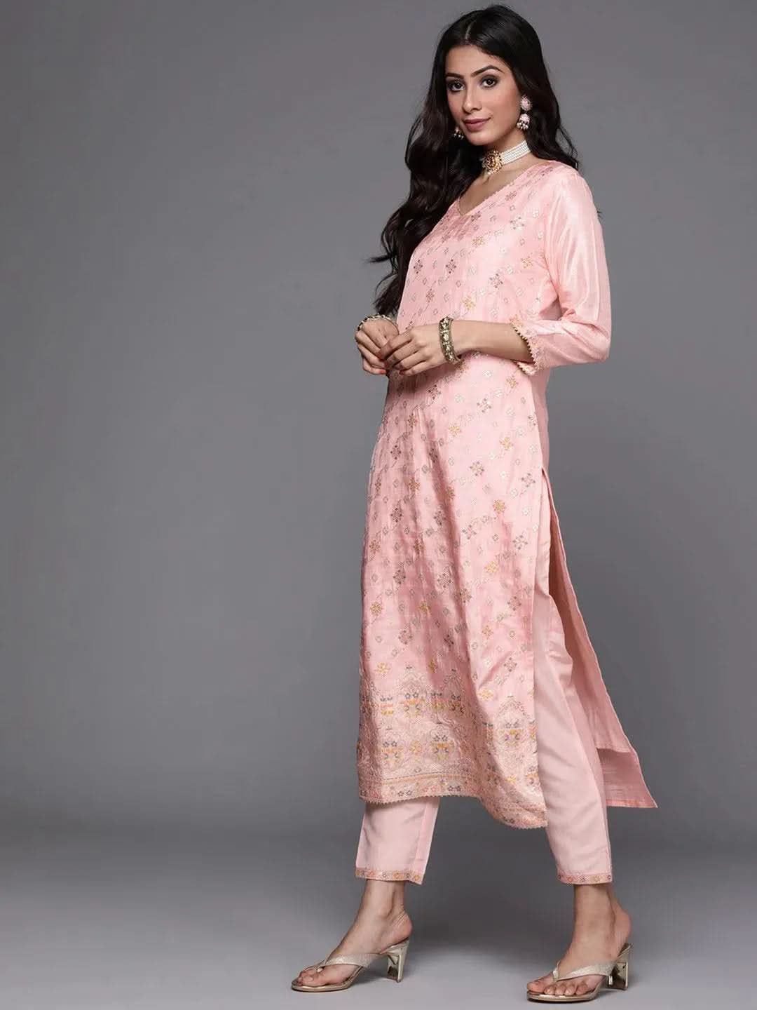 Our 3-piece pink woven design silk blend suit set features a floral motifs woven design straight-fit kurta with a V-neckline and three-quarter sleeves. Complemented with matching trousers with a fully elasticated waistband and roomy pockets, and a dupatta. Adorned with Gota patti detailing and tassels, this style is perfect for light festivities.