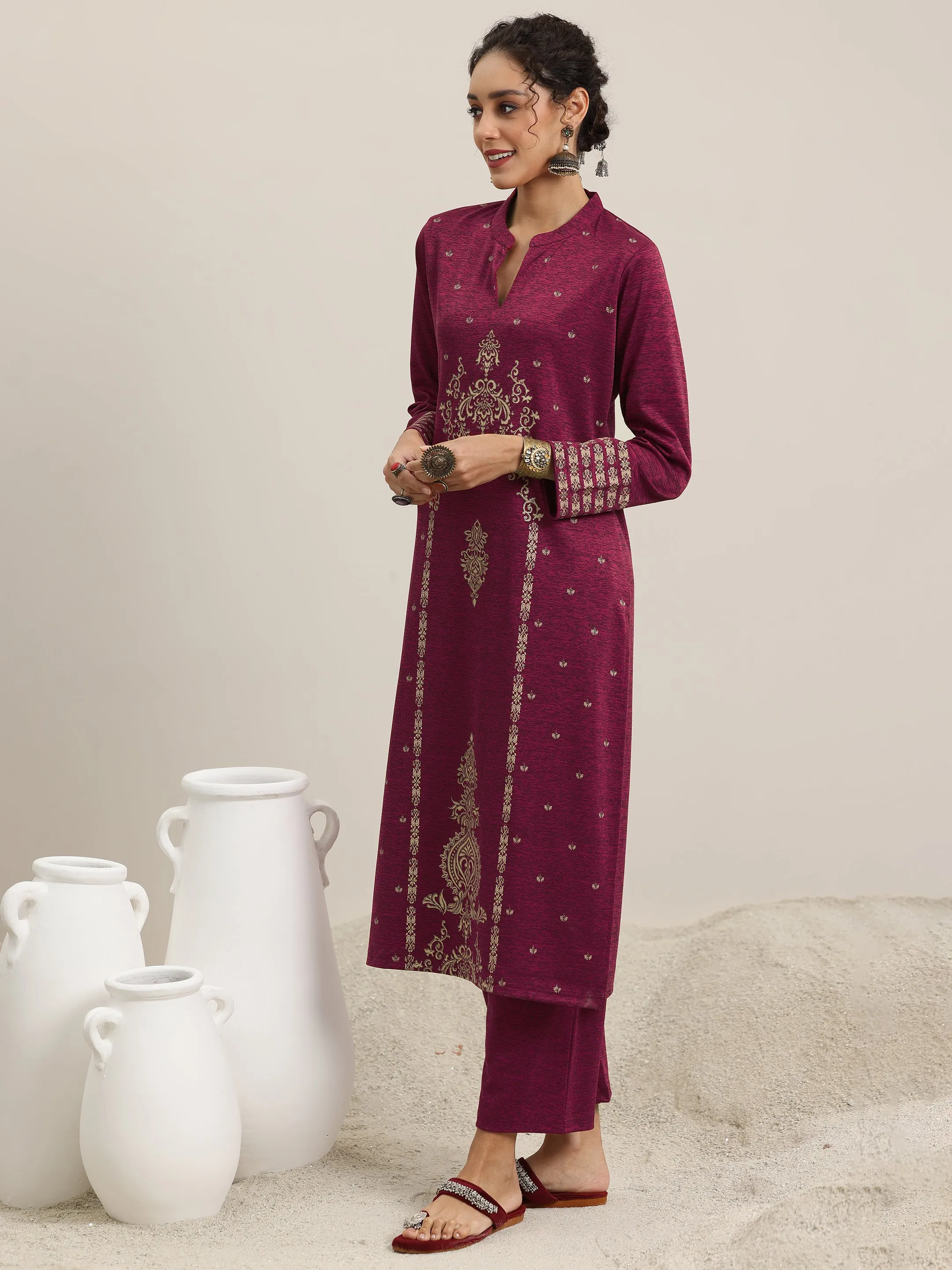 Our 3-piece pink woven design wool blend straight suit set features a kurta with mandarin notched neckline and comfortable full sleeves. Complemented with trousers with a fully elasticated waistband and roomy pockets, and a dupatta. Highlighted with ethnic motifs woven design, this style is perfect for casual outings.