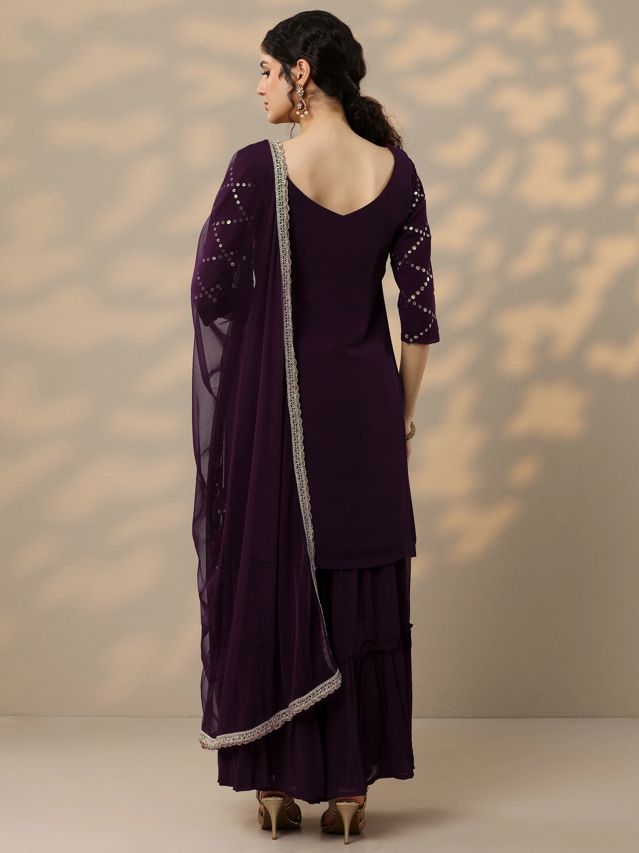 Our 3-piece burgundy georgette suit set features a sequinned straight-fit kurta with a V-neckline and three-quarter sleeves. Complemented with sharara pants with a partially elasticated waistband, and a dupatta. Adorned with thread work, sequins, and tassel detailing, this style is perfect for light festivities.