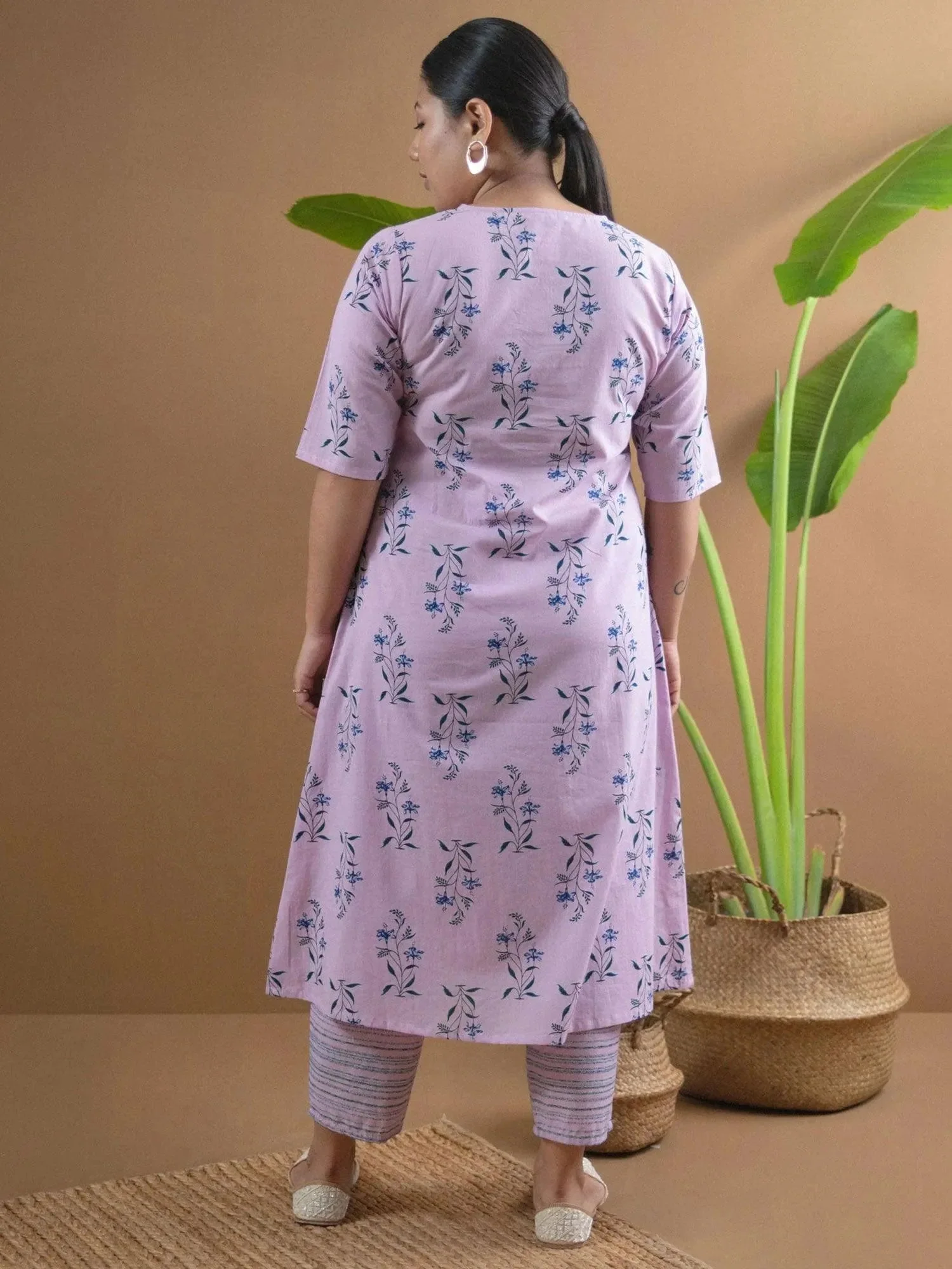 This 2-piece kurta set includes our purple round neck straight kurta with straight palazzo pants. Crafted in cotton, featuring a notched neckline and detailed with bright floral motifs. Comfortable for daily wear.