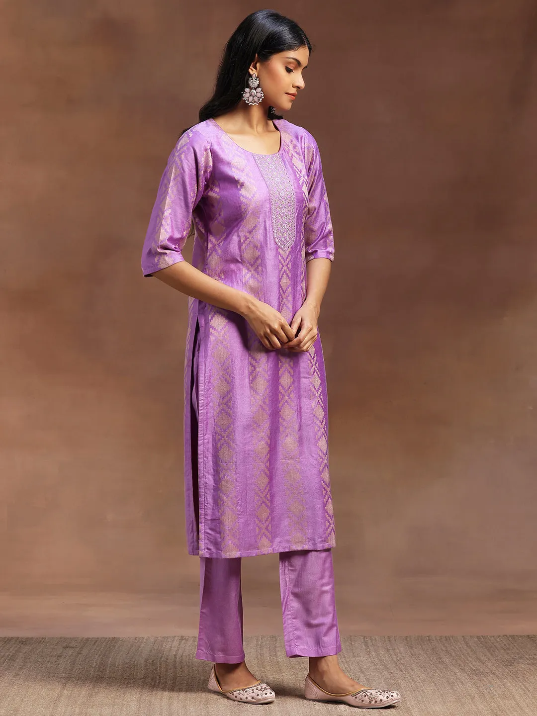 Our 3-piece purple Chanderi silk suit set features a straight-fit kurta with a round neckline, three-quarter sleeves, and a statement yoke. Complemented with trousers with a partially elasticated waistband and roomy pockets, and a dupatta. Adorned with sequins and thread work, this style is perfect for light festivities.