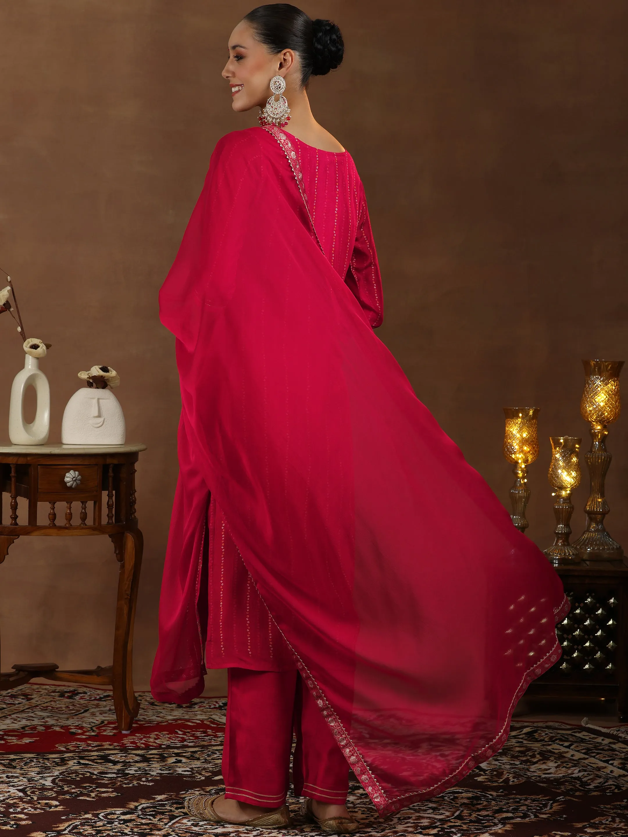 Red Woven Design Silk Blend Straight Suit With