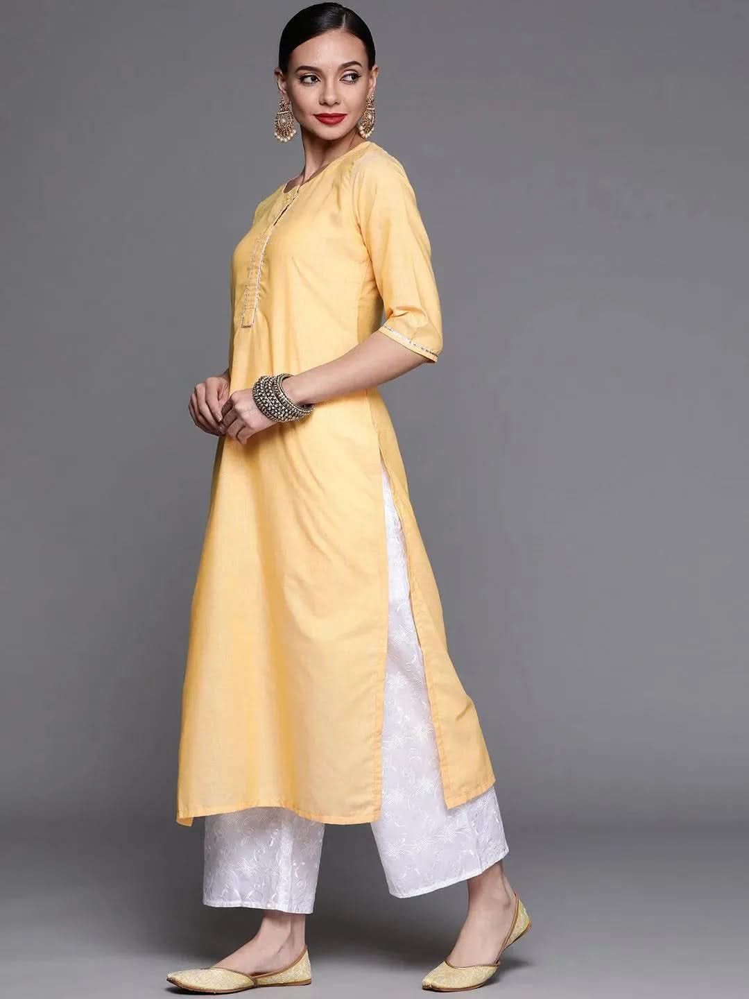 Our yellow solid kurta, crafted in cotton fabric, features a round neckline and three-quarter sleeves. Elevated with Gota Patti detailing, this style is perfect for casual outings.